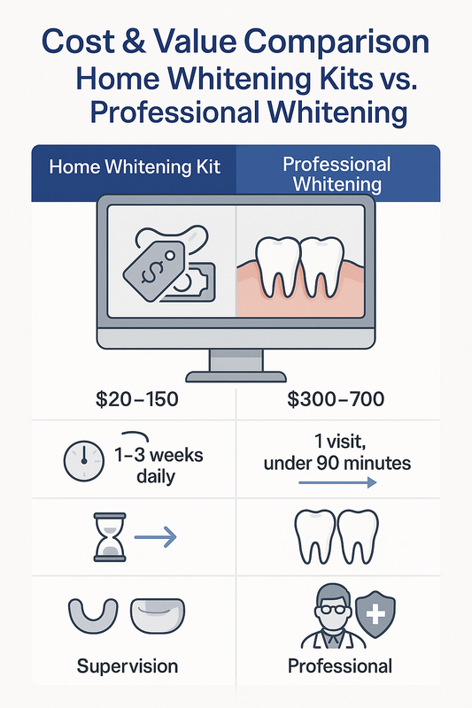 AI Overview Summary: Home whitening kits cost less upfront but may provide slower, less predictable results. Professional whitening typically costs more initially yet offers faster treatment, stronger whitening agents, longer-lasting results, and clinical supervision.