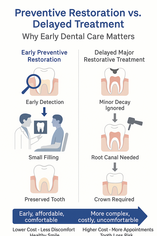 Dental infographic comparing early preventive restoration with delayed treatment, showing timelines and outcomes.