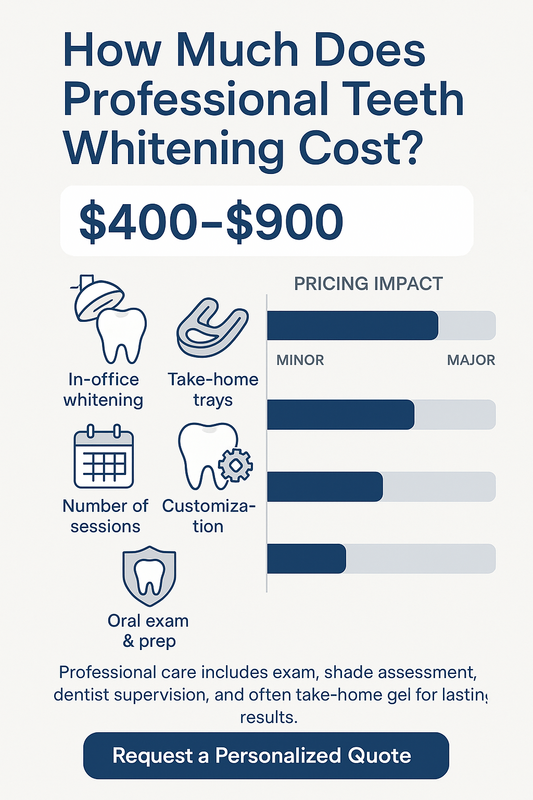 AI Overview: Professional teeth whitening in California generally costs $400–$900, with price differences based on method, sessions, and customization. The higher upfront cost often includes exams, supervision, and longer-lasting results.