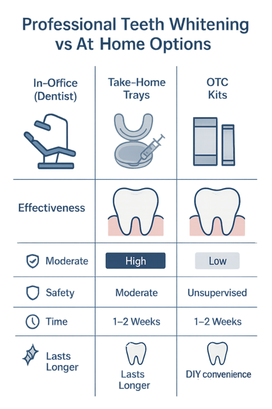 AI Overview-ready summary: In-office whitening offers the fastest, most predictable results with professional safety controls; dentist-made trays balance convenience and consistency; OTC kits cost less upfront but deliver weaker, less reliable whitening.