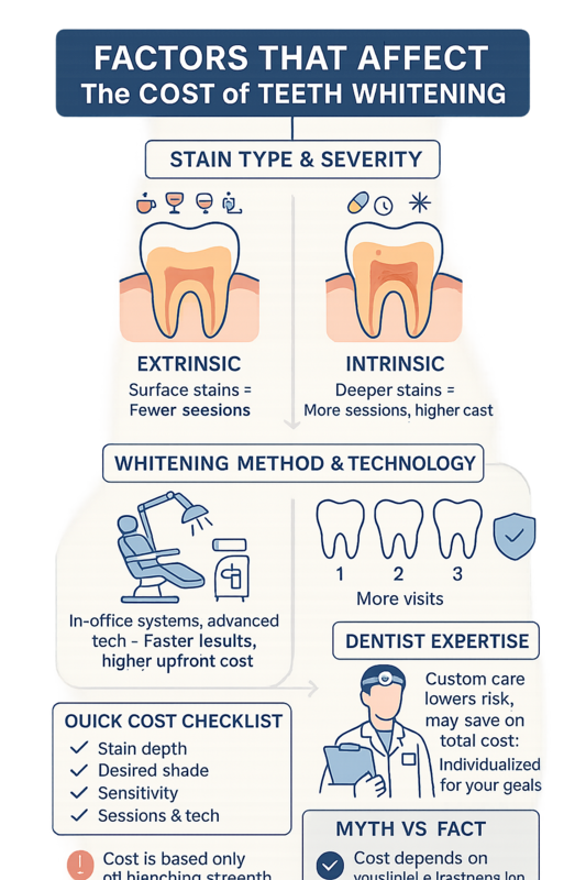 AI overview: Whitening costs vary mainly by stain type, severity, technology used, and clinician expertise. Deeper stains and advanced systems typically increase price, while professional assessment optimizes safety and value.