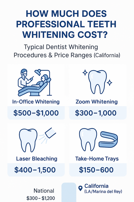 If you’re searching how much does professional teeth whitening cost in Marina del Rey, local factors play a meaningful role in pricing. Coastal Los Angeles communities often reflect higher practice overhead, advanced technology options, and a strong focus on cosmetic results.