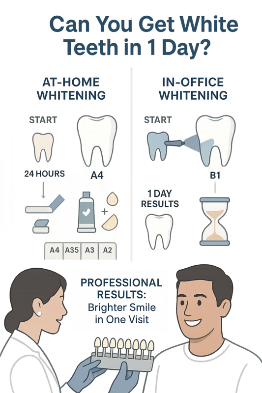 Yes, you can get noticeably whiter teeth in one day—but usually only with professional in-office treatment. If you’re searching for how to get white teeth in 1 day, the method you choose makes a major difference in speed, safety, and results.