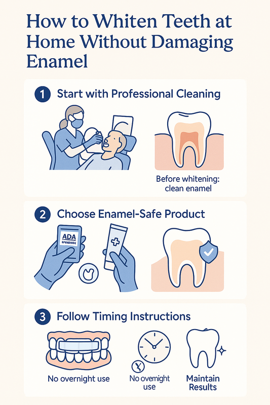 The steps below outline how to whiten teeth without damaging enamel while reducing sensitivity and protecting your long-term oral health.