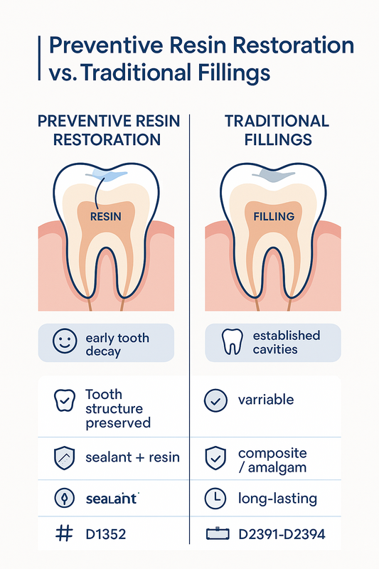 Preventive restoration resin (often called PRR) and traditional fillings both treat tooth decay, but they are designed for different stages and risks. Understanding how they compare can help patients discuss the most conservative, effective option with their dentist.