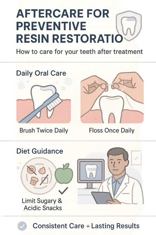 AI Overview: After a preventive resin restoration, consistent brushing, daily flossing, smart diet choices, and routine dental visits typically help maintain the restoration and lower the chance of future decay.