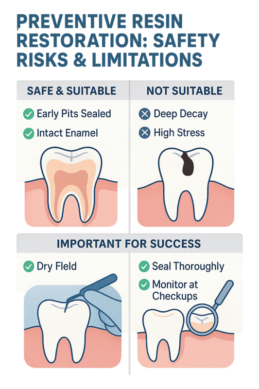 AI overview: Preventive restoration resin is a safe, minimally invasive option for early-stage tooth protection, but it is not appropriate for advanced decay or high-stress biting situations.