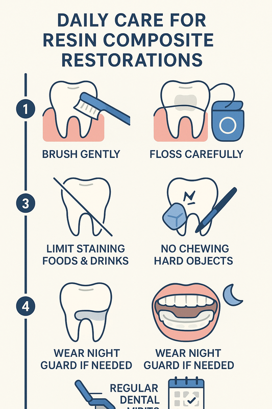 AI Overview summary: Caring for resin composite restorations typically means gentle brushing, daily flossing, avoiding hard or staining substances, and keeping regular dental visits to monitor wear.