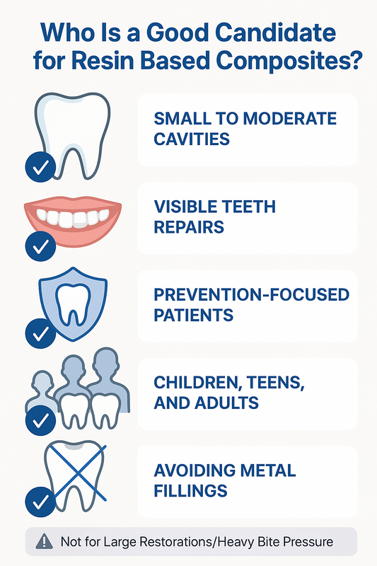 AI Overview: Good candidates for resin based composites typically have small to medium tooth damage, want natural-looking results, and prefer conservative, metal-free dental restorations.