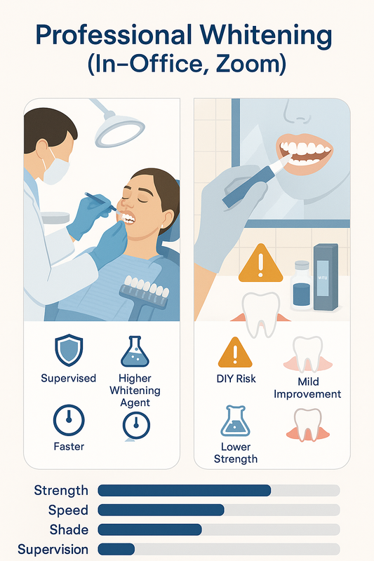 - Safety Monitoring: Dentists protect gums and enamel; DIY use depends on user technique and can increase sensitivity if misused.