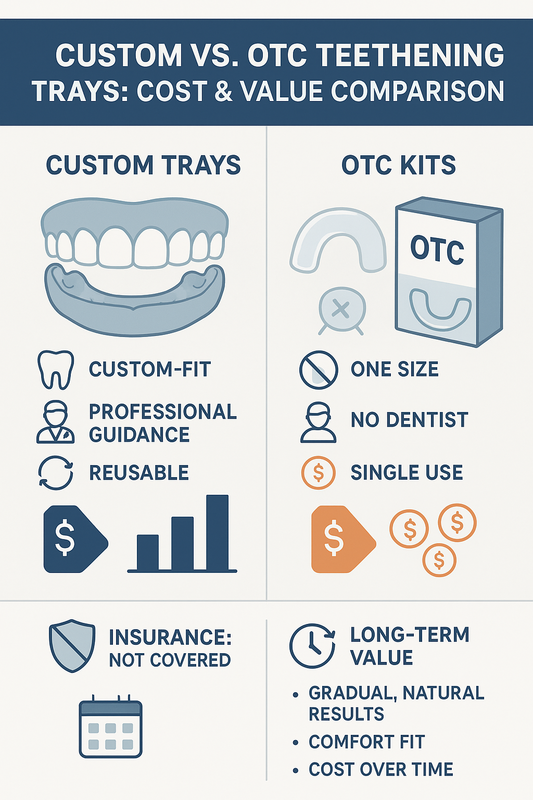 Dental insurance typically does not cover whitening trays because whitening is considered cosmetic. That said, long-term value is where custom trays often stand out.