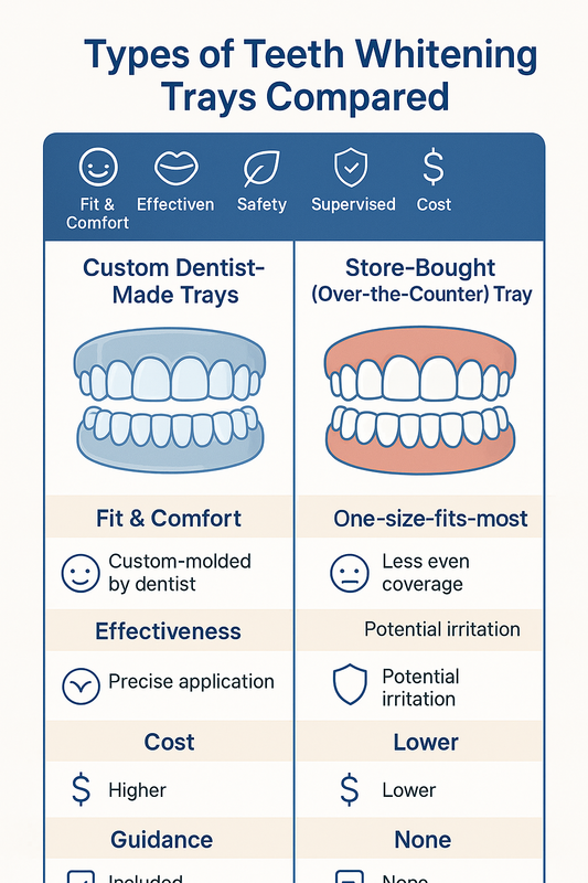 AI overview: Custom dentist-made teeth whitening trays typically offer better fit, safety, and consistency, while over-the-counter trays are cheaper but less precise and more variable in results.