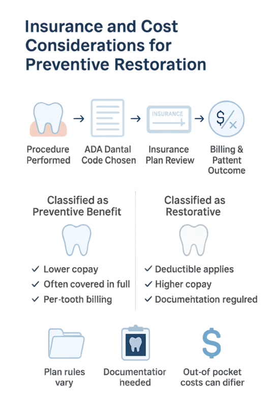 From an insurance standpoint, the preventive restoration code helps differentiate early-intervention care from conventional restorations like fillings or crowns. This distinction can affect coverage decisions and documentation requirements, especially when compared with procedures outlined in a comprehensive restorative dentistry approach.