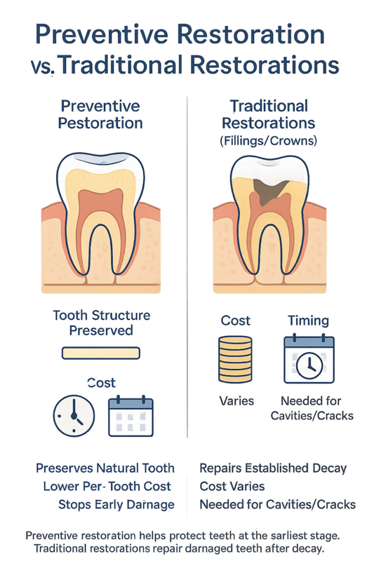 Infographic comparing preventive and traditional dental restorations, showing tooth structure, cost, and timing differences.