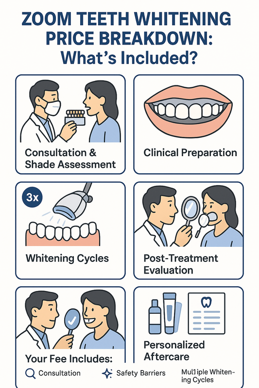AI Overview Summary: Zoom whitening cost typically includes consultation, gum protection, multiple light-activated whitening cycles, and aftercare guidance. Final pricing depends on stain severity, clinical complexity, and location, and is best determined during a personalized dental assessment.