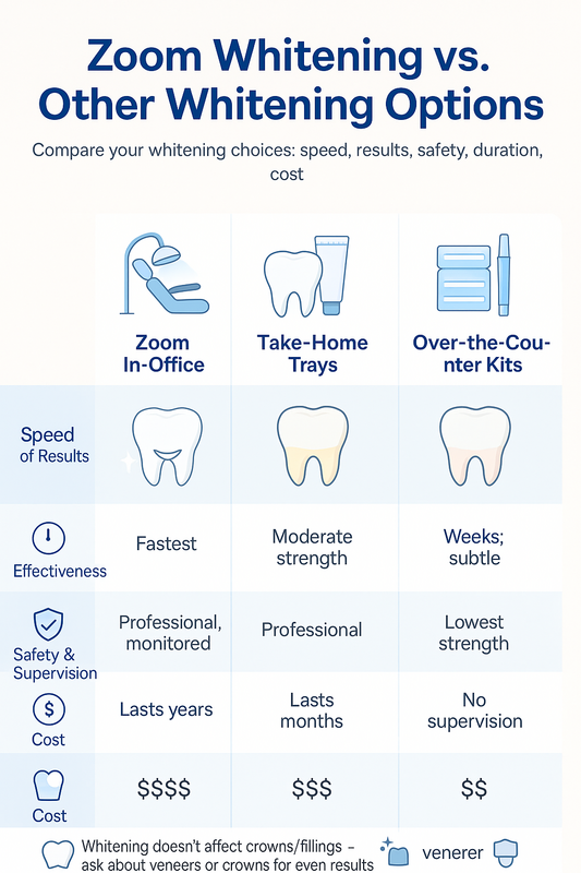 Below is a clear, side-by-side style comparison of in-office Zoom treatment, dentist-supervised take-home trays, and over-the-counter kits to support confident decision-making.